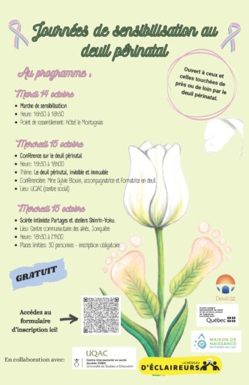 Dans le cadre de la journée mondiale du deuil périnatal, le Centre intersectoriel en santé durable (CISD) de l’UQAC, en collaboration avec le comité du projet intersectoriel sur le deuil périnatal dont les membres proviennent du CISD, du CIUSSS, de la maison de naissance du Fjord-Au-Lac, du réseau des éclaireurs et de deuil 02, vous invite à une conférence ouverte à toutes et à tous :